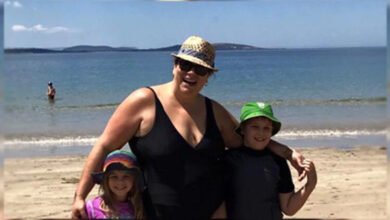 Una madre posa con dos niños, luego mira fijamente la foto y corre tras su cámara.