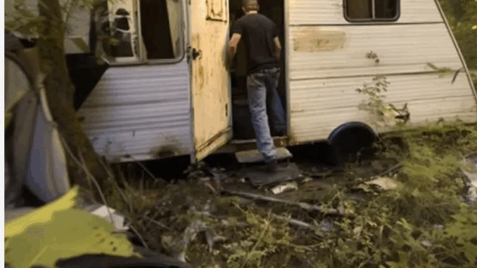 Y allí estaba: una vieja caravana oxidada, medio escondida entre los árboles. El techo se hundía bajo el peso de los parches desparejados, y todo parecía a punto de derrumbarse con un fuerte viento.