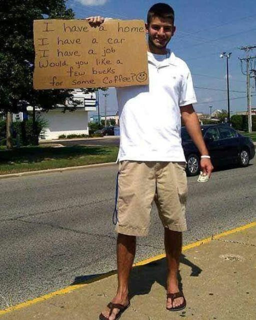 “Tengo casa. Tengo coche. Tengo trabajo. ¿Te gustaría un poco de dinero para un café? :)”
