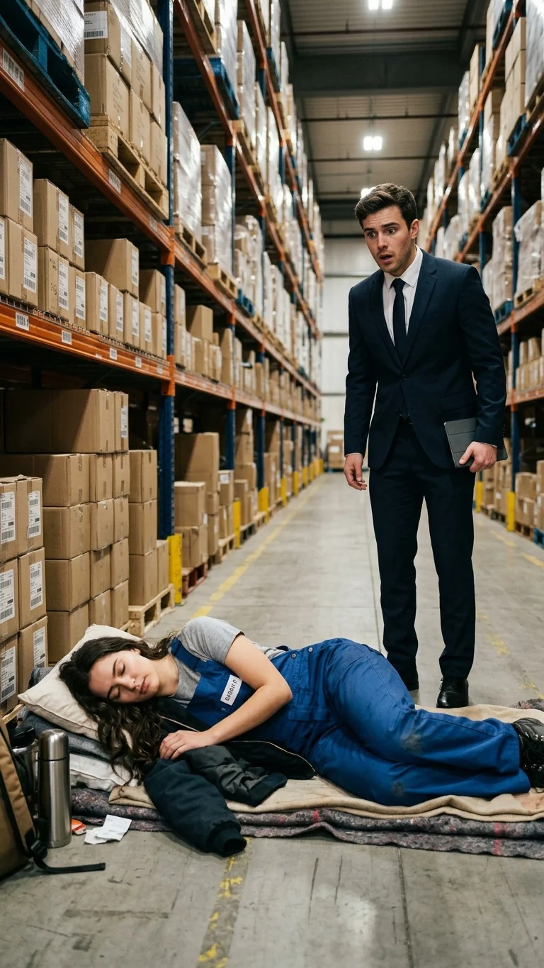 Nadie sabía que la empacadora dormía en la bodega para sobrevivir, hasta que el millonario dueño revisó las cámaras y descubrió un escalofriante secreto