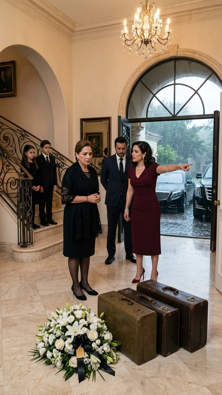 El aire en la lujosa casa de Lomas de Chapultepec todavía olía a los crisantemos y al incienso del velorio. Carmen, una mujer de 60 años con el rostro cansado y el vestido negro empapado por la tormenta que azotó la Ciudad de México esa tarde, aún sentía en sus dedos el frío del ataúd de su esposo, Arturo. Sin embargo, no tuvo tiempo para procesar su luto. En medio del vestíbulo de mármol, Valeria se plantó firme, con sus tacones de diseñador resonando, y señaló 3 maletas arrinconadas junto a la puerta del garaje.