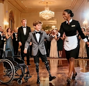 En un elegante salón de baile, un hombre millonario fue testigo de un momento que transformó por completo la atmósfera. Su hijo pequeño, que usa silla de ruedas debido a una discapacidad, observaba a los bailarines con fascinación, pero sin animarse a participar. De repente, una camarera afroamericana que trabajaba en el evento se acercó, le extendió la mano y, con delicadeza, le preguntó si quería bailar. El salón quedó en silencio, sin saber cómo reaccionar.